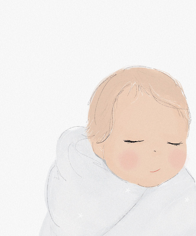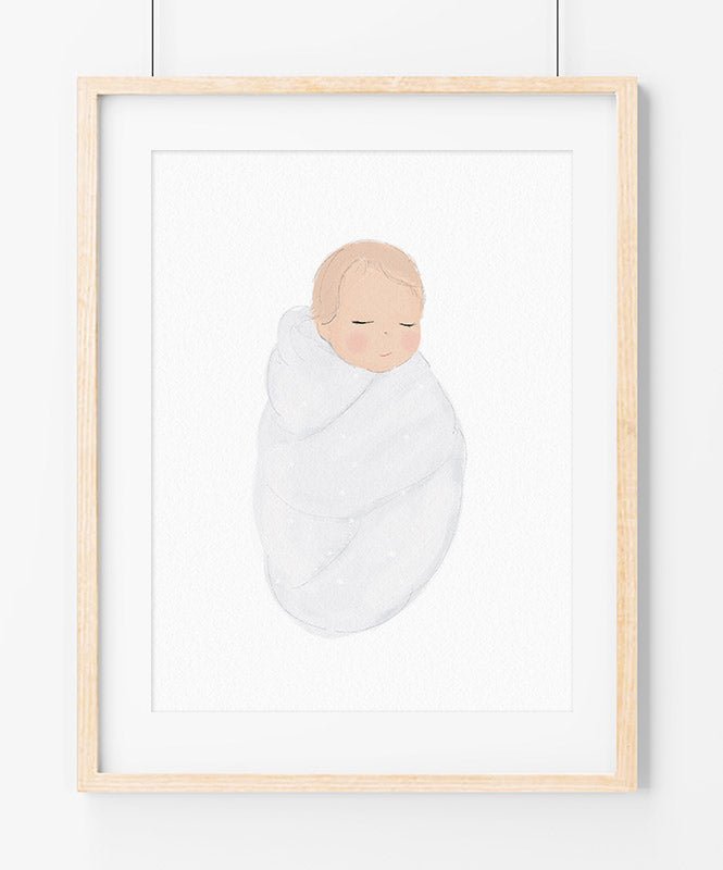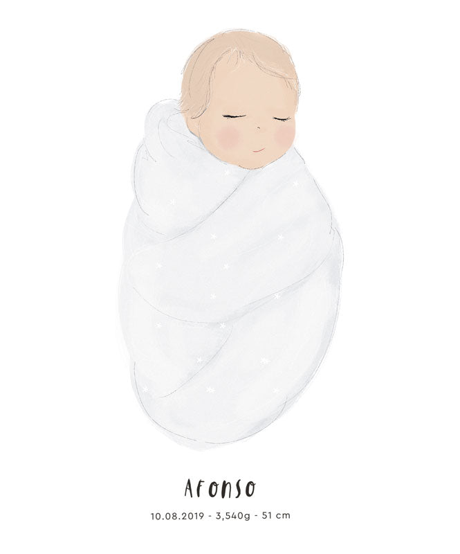 Póster con un bebé envuelto en una manta blanca. Una dulce ilustración vintage que encaja perfectamente en la habitación de un bebé. Esta ilustración es parte de nuestra colección "Twinkle, Twinkle".