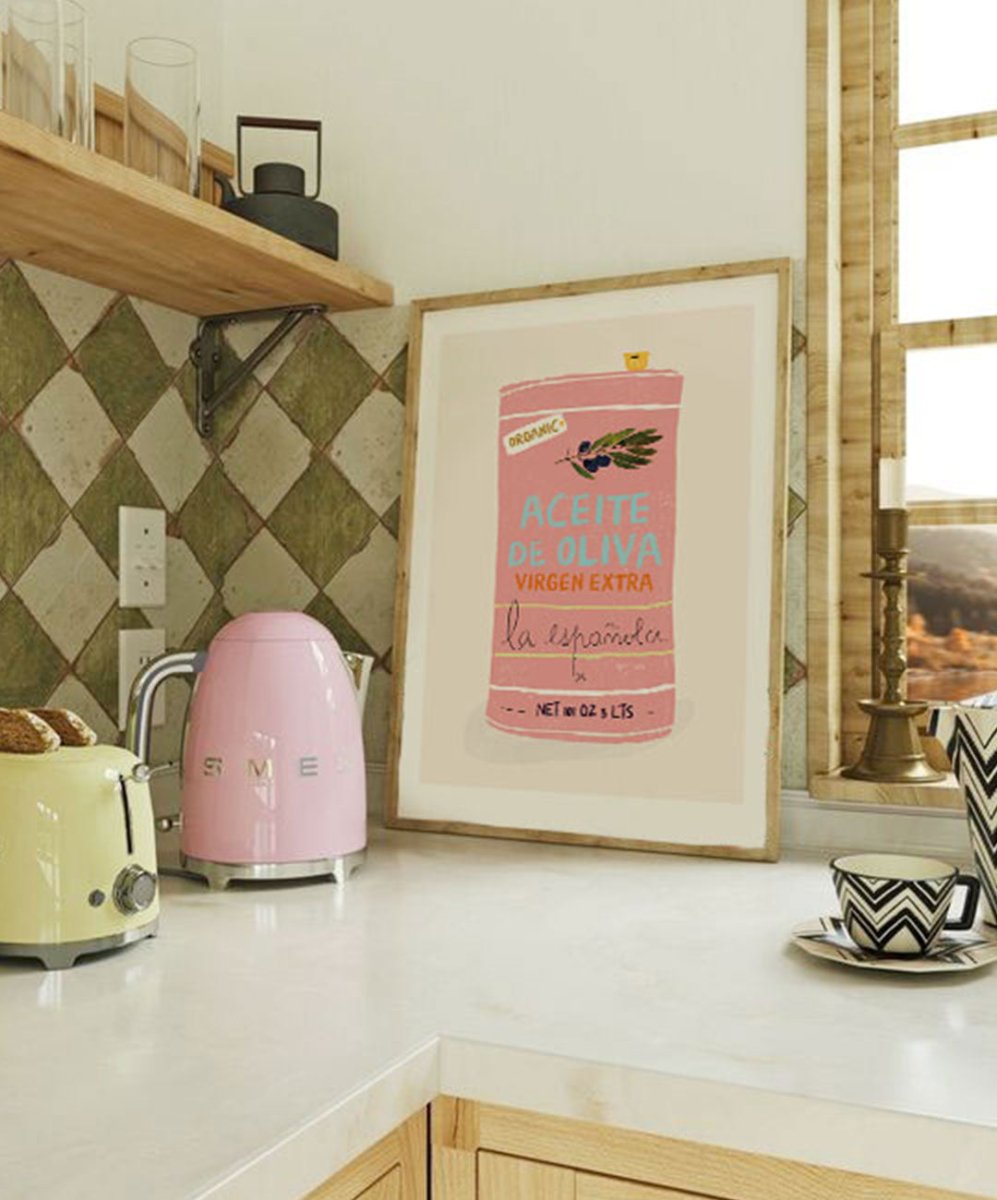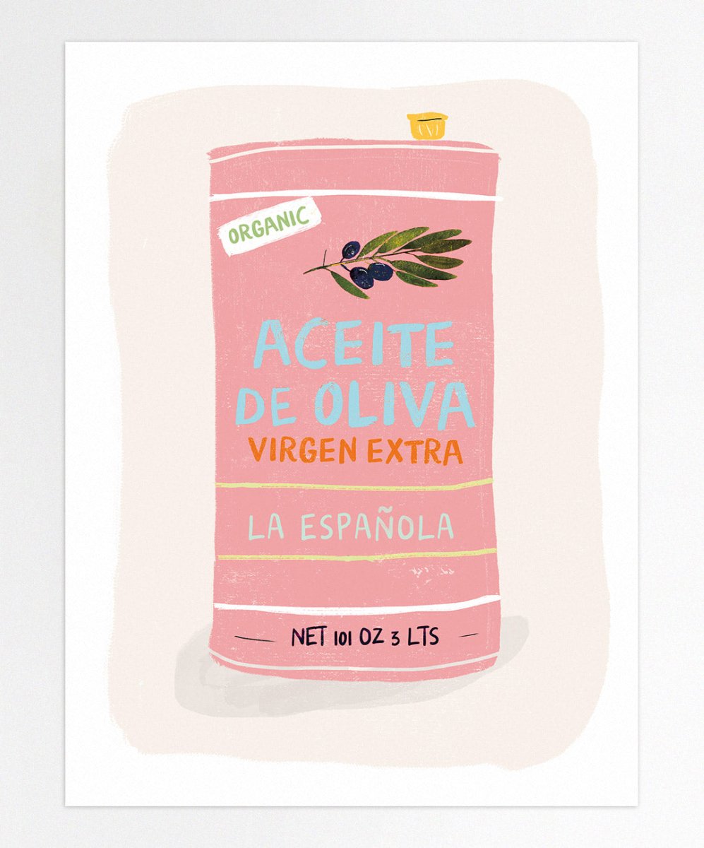 Add a Mediterranean touch to your decor with the "Aceite de Oliva" poster from Catita Illustrations. Featuring a stylized pink olive oil can, this poster captures the essence of olive oil, a symbol of Southern European cuisine. Perfect for culinary and interior decoration enthusiasts, available in 3 sizes. Enrich your space with this culinary icon, a must-have for any modern kitchen. Get your physical copy now and bring the taste of the Mediterranean home!