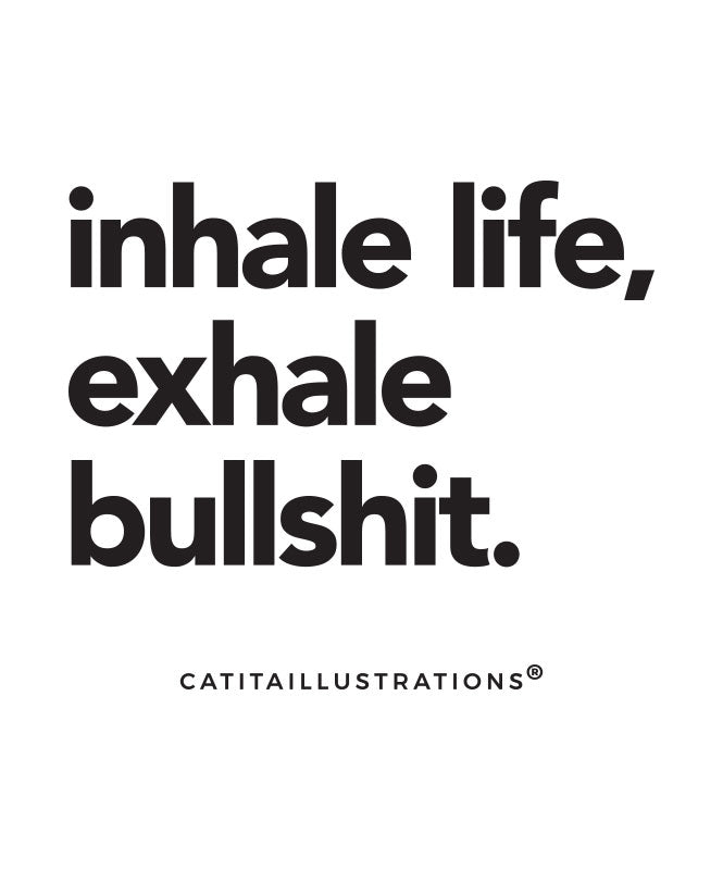 White short-sleeved T-shirt with a round neck and the message “ Inhale life, exhale bullshit ” . This t-shirt is original Catitaillustrations .