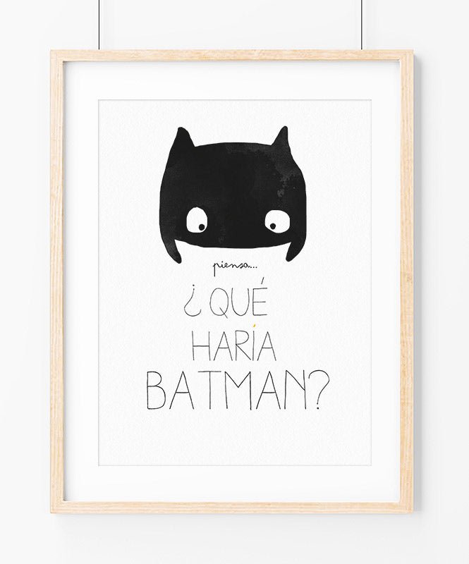 Poster with a batman mask and the text “ think... what would batman do? ”. A fun illustration that fits perfectly in the decor of children's rooms.