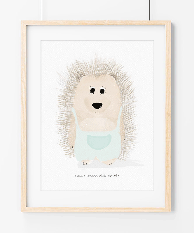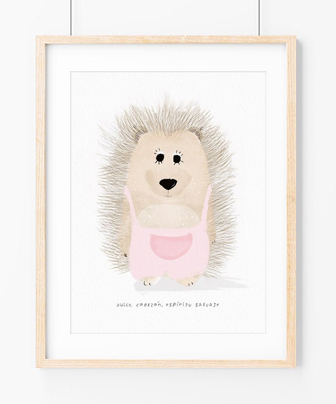 A poster featuring a Dear Hedgehog dressed in a pink or mint jumpsuit, also includes the phrase “Sweet heart, wild spirit.” A fun illustration that fits perfectly in the decoration of the children's rooms. This poster belongs to the Little and Brave collection and is an original illustration by Catitaillustrations. This poster is also available in Portuguese and Spanish.