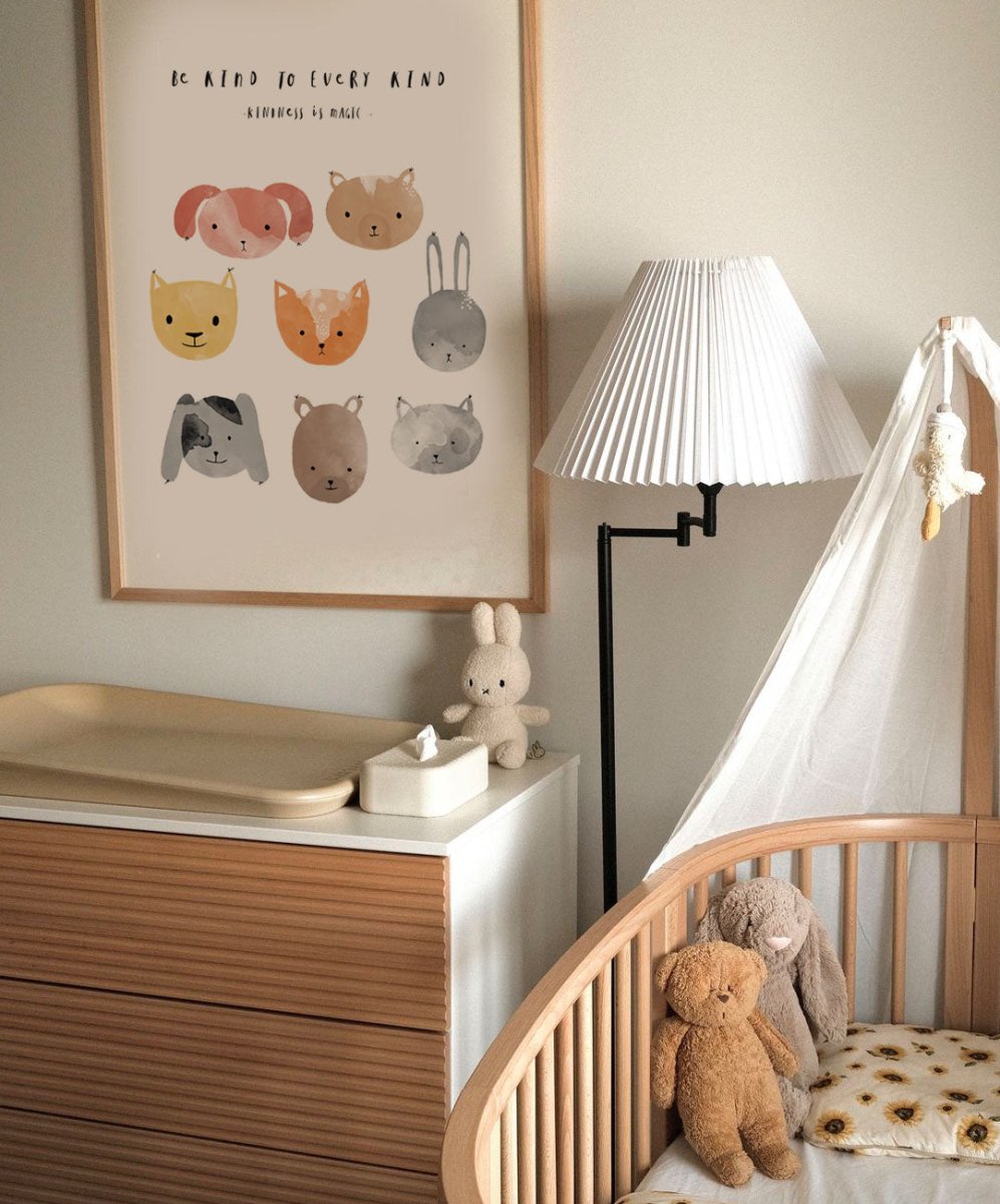Poster com um grupo de animais e com a frase “Be kind to Every Kind”. Uma divertida ilustração que encaixa perfeitamente na decoração dos quartos das crianças.