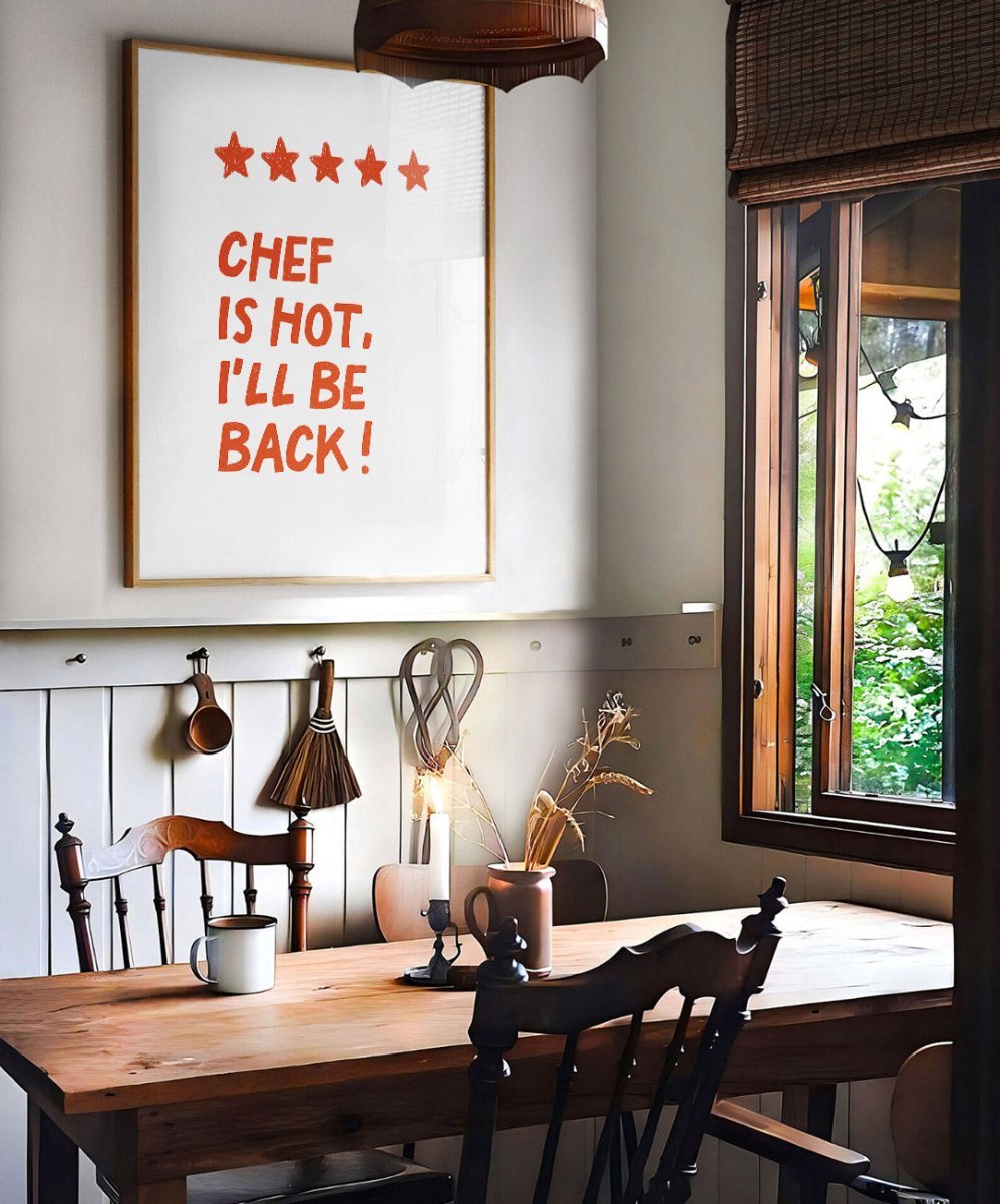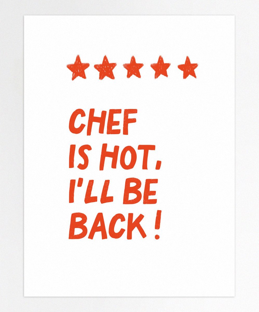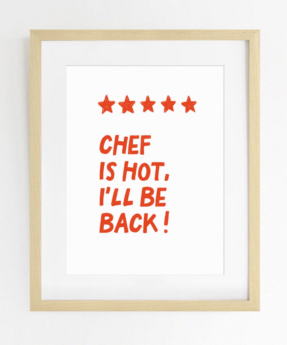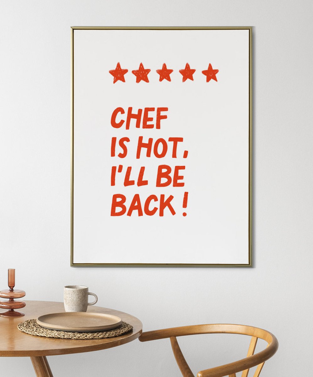 Acrescente um toque de humor à sua cozinha com o "Poster Chef is Hot, I’ll be back!". Com 5 estrelas e a promessa "Chef is HOT, I’ll be back!", é o detalhe ideal para lembrar momentos únicos entre amigos e amores. Está disponível em vários tamanhos, na versão física ou digital.