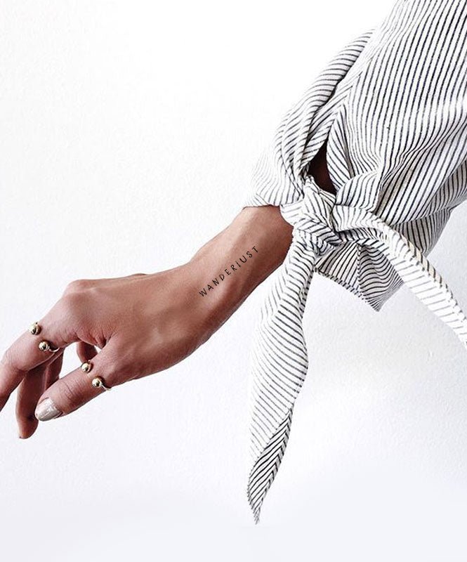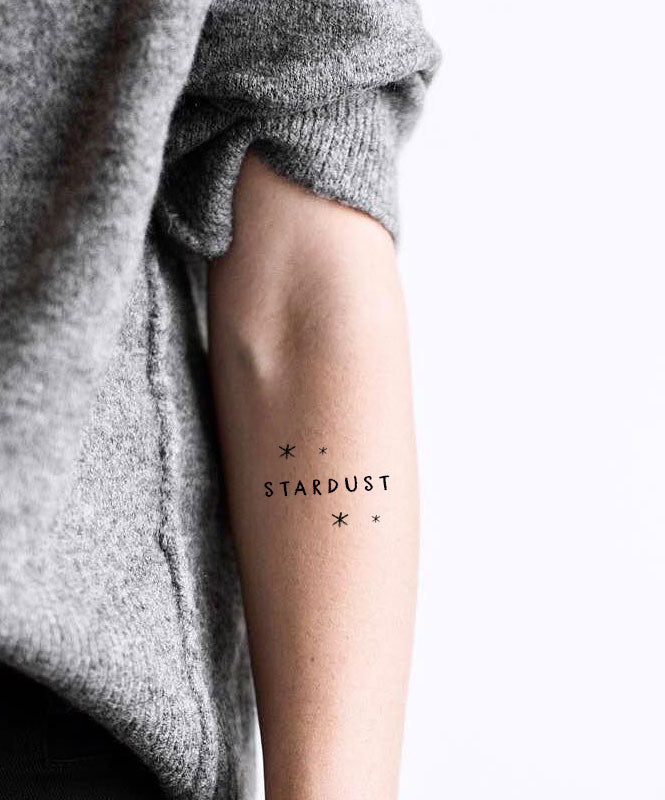 Pack com 6 Tatuagens Temporárias, 1 com a palavra "Wanderlust", 1 com "Stardust" e 4 mini estrelas.